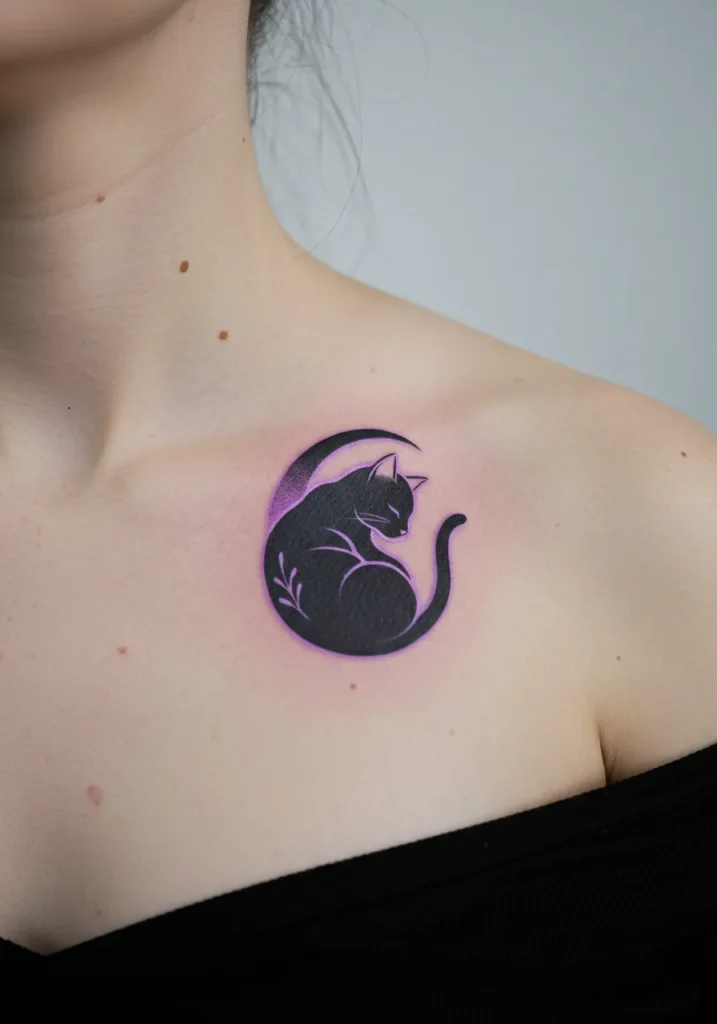 This mystical little tattoo features a sleek black cat curled perfectly into a crescent moon shape, framed with soft purple glow and delicate line accents. The design is ultra clean and minimal, with smooth curves and just a touch of nature-inspired flair on the cat s body. The moon and cat blend seamlessly into one graceful shape, and the placement right above the collarbone gives it a bold yet elegant feel that works with so many different styles.