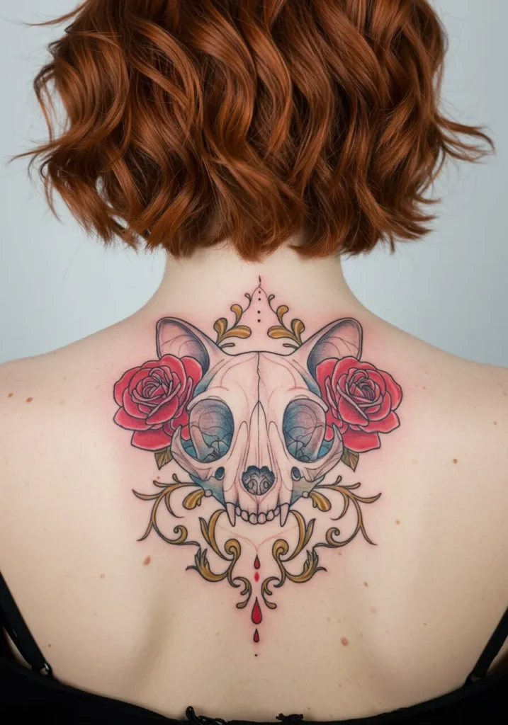 This gorgeous back tattoo features a bold cat skull in the center, flanked by two vibrant red roses and surrounded by flowing ornamental flourishes. Even though it s a fine line piece, the use of color makes it seriously eye-catching. The delicate golden accents and soft blue shading inside the skull give it a dreamy, mystical vibe. Everything is super clean and symmetrical, which adds to the charm. And let s not ignore the little blood drop details below it gives the whole thing a dark romantic twist.