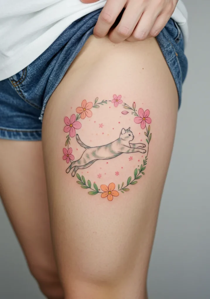 This sweet and playful tattoo shows a leaping tabby cat mid-pounce, framed by a circular wreath of colorful flowers and soft green leaves. The linework is super clean and fine, with just enough shading on the cat to give it a soft, furry feel without losing that minimalist charm. The flowers in pink, orange, and coral add a cheerful pop of color, and the tiny dots scattered around the background make the whole design feel light and whimsical. It s placed perfectly on the thigh, giving it space to shine without overwhelming the area.