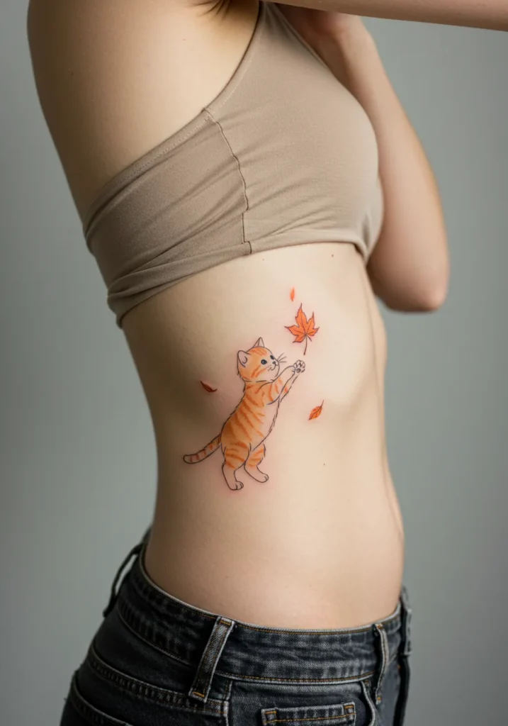 This adorable rib tattoo shows an orange tabby kitten standing on its hind legs, reaching up for a fluttering maple leaf. The fine line style keeps the outline crisp and clean, while the soft orange and red tones bring the fall vibe to life. A few scattered leaves float around the kitten, adding movement and charm without making the design too busy. It fits perfectly along the natural curve of the ribcage, giving it a flowy, playful feel that looks amazing from every angle.
