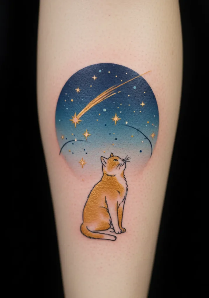 This magical forearm tattoo features a soft orange cat gazing up at a sky full of stars and a golden shooting star arcing across a deep twilight background. The fine linework keeps it light and refined, while the color gradient in the sky from soft blue to indigo creates a dreamy backdrop that totally pulls you in. The cat s simple shape and subtle shading give it that minimalist vibe without losing personality. It all sits perfectly in a circular frame, which makes it feel neat and intentional.