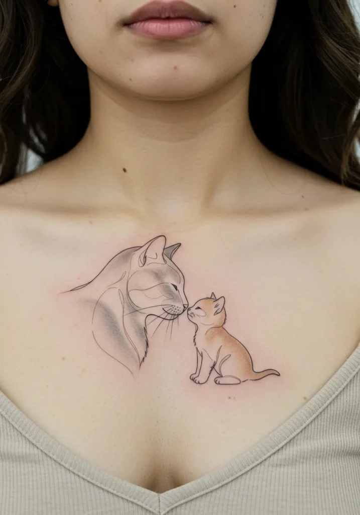 This beautifully tender tattoo shows a sweet moment between a mother cat and her kitten, captured right in the center of the chest. The mama cat is done in soft grey fine lines with gentle shading, while the kitten is fully colored in a soft orange hue. Their noses touch so delicately it almost feels like the tattoo is breathing. The contrast between the more outlined style of the mother and the subtle coloring of the kitten makes the whole thing feel dynamic but still totally harmonious.