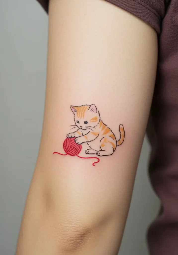 This adorable tattoo features a tiny orange-striped kitten playing with a bright red ball of yarn, all outlined in soft fine lines for a super clean and playful look. The kitten s chubby little paws and curious face give it tons of personality, and the red thread curling off the yarn adds just the right amount of movement and color contrast. It sits perfectly on the upper arm, making it visible and sweet without feeling too loud.