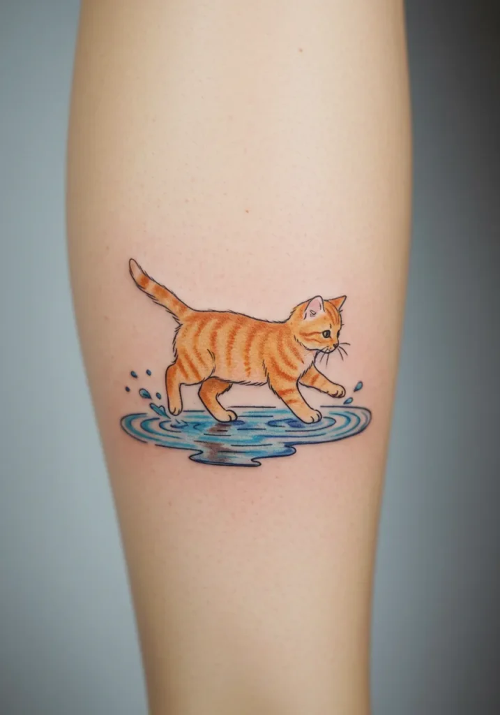 This playful tattoo captures an orange tabby cat mid-stride, carefully tiptoeing through a pool of bright blue water. The fine linework gives it a soft, animated look, while the ripples and droplets add a fun little splash of motion. The kitty s focused expression and fluffy stripes make the scene feel like a moment stolen straight from real life like your own cat s little adventure during an unexpected rain puddle moment.