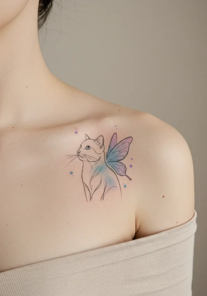 This whimsical collarbone tattoo features a sleek fine line cat with delicate butterfly wings colored in soft shades of lavender, blue, and pink. The outline of the cat is super minimal, giving it a clean and airy look that pairs perfectly with the magical watercolor-style wings. Tiny dots in matching pastel hues float gently around the design, adding a light and playful atmosphere. The placement makes it feel like the little cat fairy just landed on your shoulder for a visit.