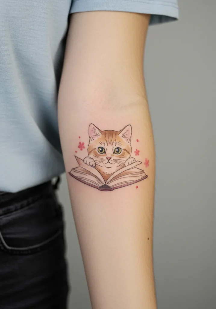 I love everything about this one. It s cozy, quirky, and gives big introvert energy in the best way. If you ve ever curled up with a good book and your favorite cat by your side, this tattoo will hit you right in the heart. It s a sweet little tribute to quiet moments, daydreams, and feline companions who always know exactly when to sit on your book.