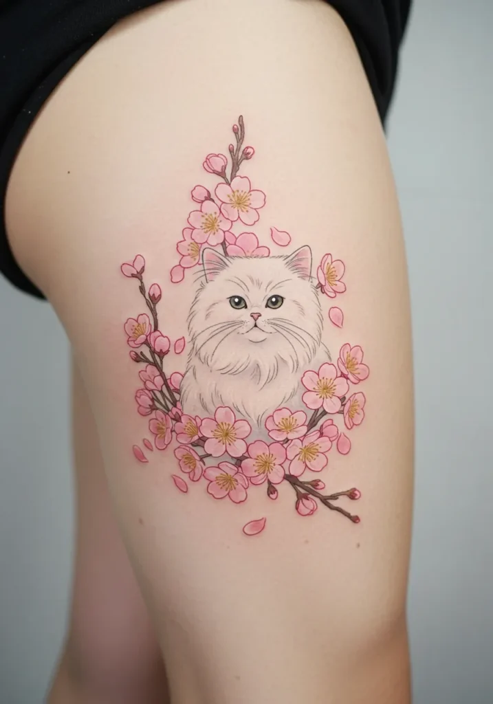 Persian Cat with Cherry Blossom Thigh Tattoo