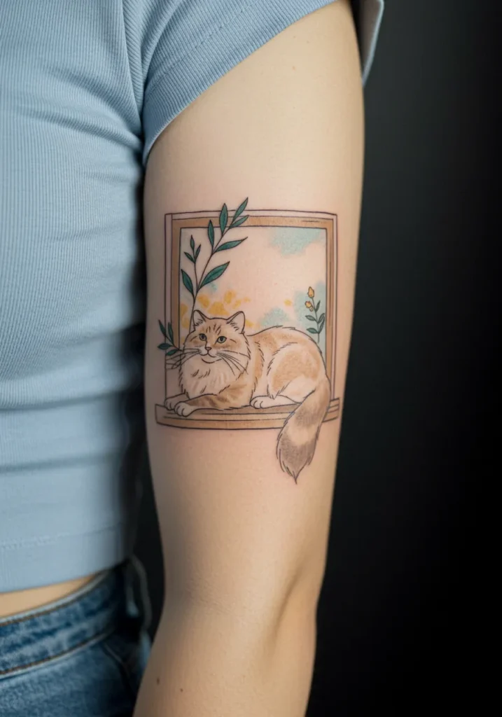 This charming tattoo features a fluffy beige cat lounging on a windowsill, framed by leafy stems and a dreamy pastel sky in the background. The fine line details give it a light and delicate feel, while the soft watercolor-style coloring adds warmth and personality. The square frame makes the whole piece feel like a cozy snapshot, almost like you re catching a quiet moment in a calm little story. The placement on the upper arm gives it enough space to breathe without making it too bold.