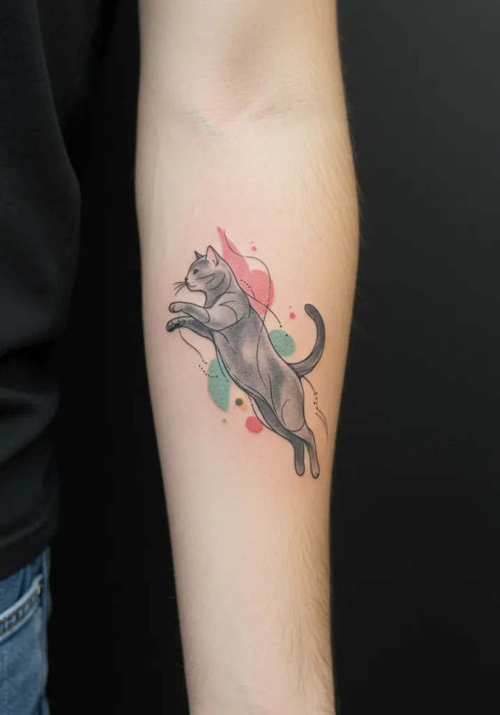 This sleek forearm tattoo features a leaping grey cat caught mid-air, surrounded by playful pops of color in muted reds, greens, and peach. The fine line outline keeps everything sharp and minimal, while the smooth shading on the cat gives it a little extra depth. Geometric dots and abstract watercolor splashes add a modern twist that makes the whole piece feel super fresh and artsy. It s positioned right on the inner forearm, which gives it room to stretch out without being too bold.