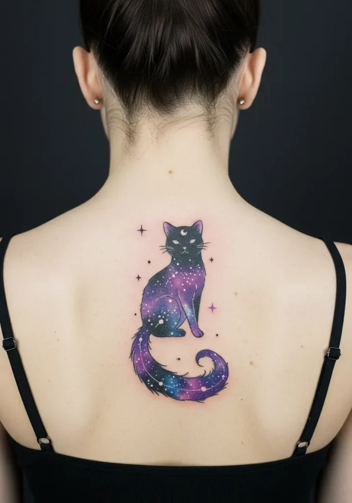 This stunning back tattoo features a majestic black cat with a cosmic twist. The cat s body is filled with a dreamy galaxy blend of purples, blues, and pinks, all dotted with tiny stars and sparkles. A dainty crescent moon sits between its ears, adding a touch of mystery and magic. The fine line edges keep everything crisp and elegant, while the flowy curled tail gives the whole piece a soft and balanced shape. Positioned perfectly along the spine, it s bold without feeling heavy.