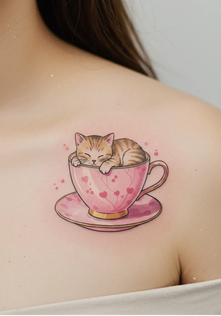 This ridiculously cute tattoo shows a tiny striped kitten curled up and fast asleep in a pink teacup covered in little hearts. The fine linework keeps it clean and delicate, while the warm tones of the cat and the soft pinks of the cup give it such a cozy, feminine feel. The placement on the shoulder adds just enough visibility without being too in-your-face, and the blushy dot accents around the cup give it a gentle pop of whimsy.