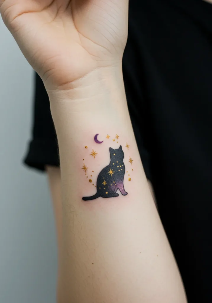 This dainty wrist tattoo features a silhouette of a sitting black cat, softly fading into purple near the bottom, surrounded by golden starbursts and a tiny crescent moon overhead. The delicate star pattern wraps around the cat s back in a graceful arc, creating a halo effect that makes the design feel magical without being flashy. The whole thing is compact and clean, perfect for a wrist or anywhere you want something subtle yet full of personality.