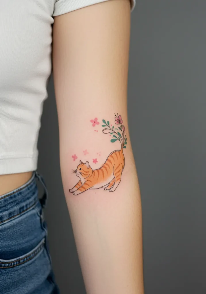 This playful fine line tattoo features an orange tabby cat in a sweet little stretch pose, looking totally relaxed and full of personality. The cutest part? A delicate bouquet of leaves and blossoms sprouts from the tip of its tail, adding a splash of whimsy that makes the whole piece feel alive. Soft pink flowers float around the design like petals caught in a breeze, giving it a super fresh and feminine vibe. Placed along the arm, it fits naturally with the shape of the body and adds just enough color to stand out.