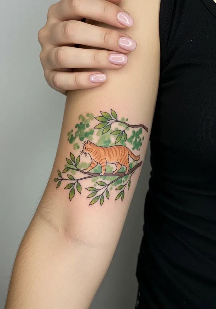 This beautiful tattoo captures a curious orange tabby walking across a leafy tree branch, surrounded by fresh green foliage and soft watercolor-style shading in the background. The cat s stripes are neatly inked, while the leaves pop with different shades of green that give the whole scene a dreamy, foresty feel. It s detailed without being too busy, and the fine lines keep everything light and breezy.