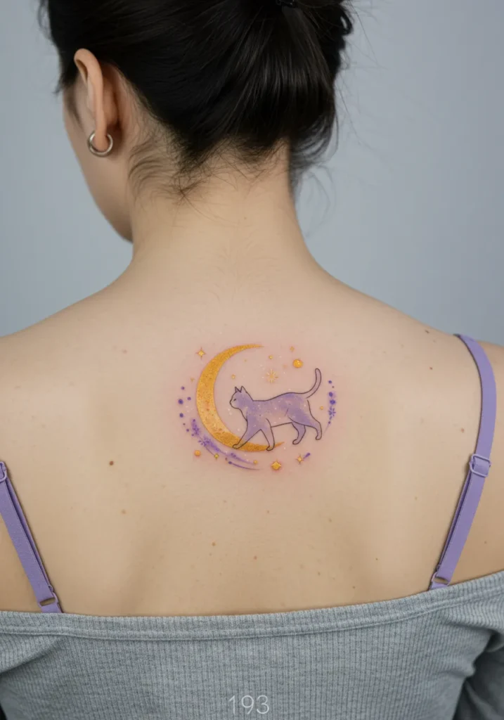 This dreamy upper back tattoo features a sleek fine line cat walking confidently in front of a shimmering golden crescent moon. The cat itself is filled with a soft purple galaxy effect, sprinkled with little stars that make the whole scene feel like it s pulled straight from a magical dream. Surrounding the moon are tiny bursts of orange and lavender stardust, giving it a soft glow and so much charm without being over the top. The whole piece is centered perfectly between the shoulders, like a little piece of cosmic art sitting right on your spine.