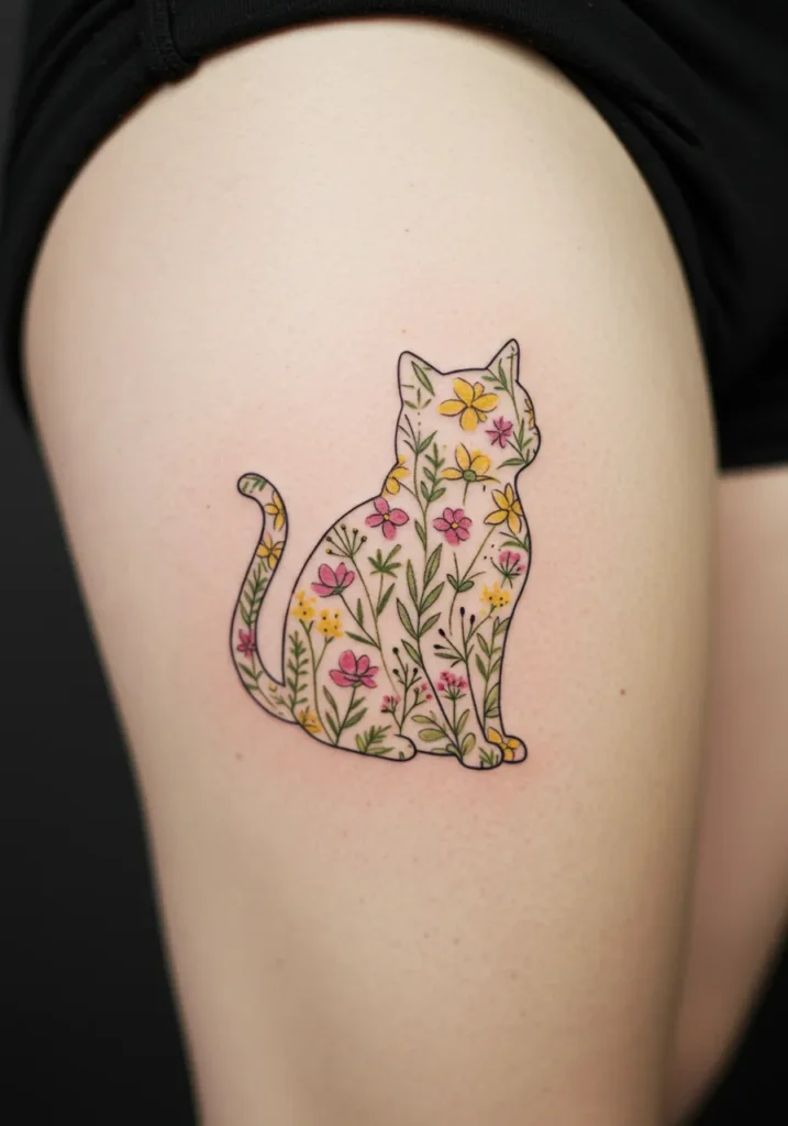 This whimsical thigh tattoo uses the silhouette of a sitting cat as a frame for a whole garden of tiny flowers and leafy green stems. The outline is crisp and minimal, while the interior bursts with dainty blossoms in shades of yellow, pink, and violet. Each flower looks like it was carefully hand-drawn with a super fine liner, which makes the whole design feel delicate but full of personality. The balance of soft colors with simple black lines makes it easy to love without being too loud.