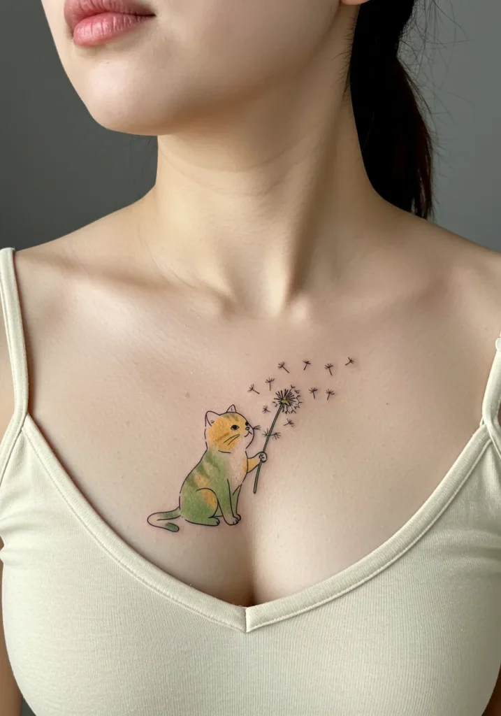 This soft and whimsical chest tattoo features a pastel-toned cat holding a delicate dandelion stem, with tiny seeds floating off into the breeze. The cat is shaded in dreamy blends of green, peach, and golden hues, giving it a watercolor feel that s both gentle and playful. The fine line style keeps the details light and airy, while the placement just above the heart adds to the sweetness of the whole design. Each floating seed almost looks like a little wish drifting off into the air.