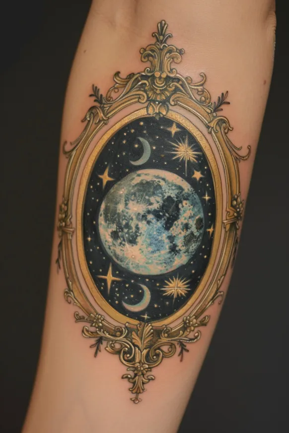 This breathtaking Victorian-inspired moon tattoo looks like a celestial treasure framed in an ornate golden mirror. The rich navy background sets the perfect stage for the glowing full moon, delicate crescent shapes, and twinkling stars. The intricate gilded frame gives it a regal, antique charm that feels like something from a Victorian parlor filled with mysterious heirlooms and celestial wonders. Every detail, from the soft shading on the moon to the delicate golden flourishes, makes this design feel timeless and magical.