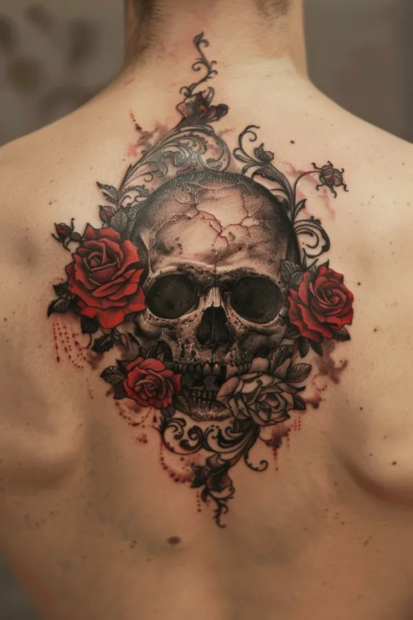 A hauntingly beautiful Victorian skull tattoo takes center stage, framed by ornate baroque swirls and deep red roses. The cracked, textured bone gives it a dramatic, almost aged look, while the rich black shading adds depth and realism. Bold splashes of crimson red roses contrast against the monochrome details, creating a powerful mix of life and decay, beauty and darkness. Placed across the upper back, this tattoo commands attention, with its intricate flourishes weaving through the design like antique ironwork.
