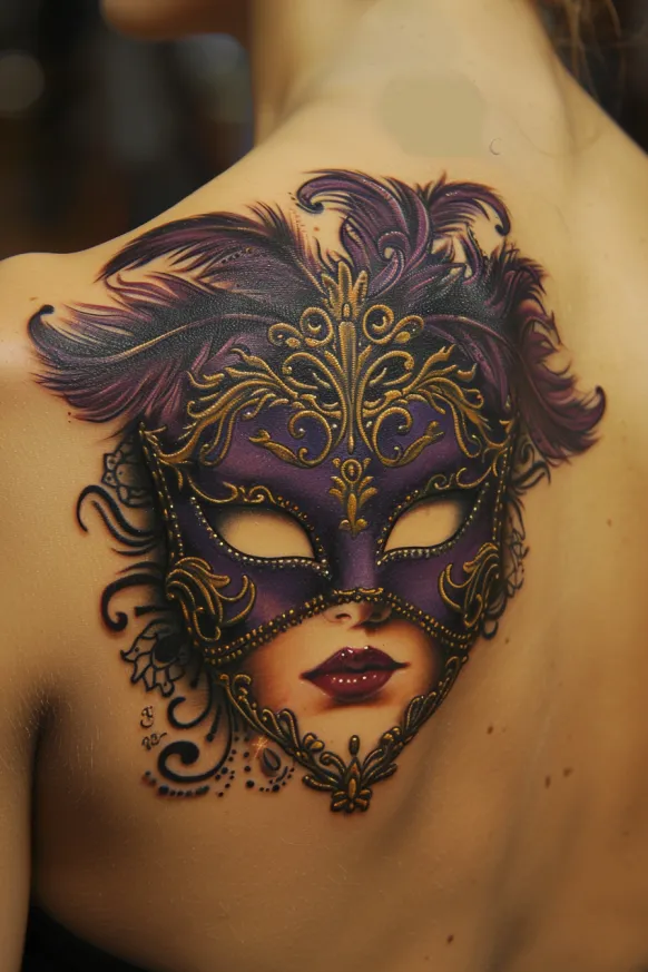 A mesmerizing Victorian masquerade mask takes center stage in this stunning back tattoo. The deep purple mask, adorned with gold filigree and delicate embellishments, gives off an air of mystery and elegance. Flowing plume-like feathers extend outward, adding a dramatic, almost theatrical effect. Beneath the mask, a beautifully painted feminine face peeks through, with softly shaded lips and eyes that hint at a hidden story. Swirling ornamental details complete the design, making it feel like a piece of Venetian luxury with a Victorian twist.