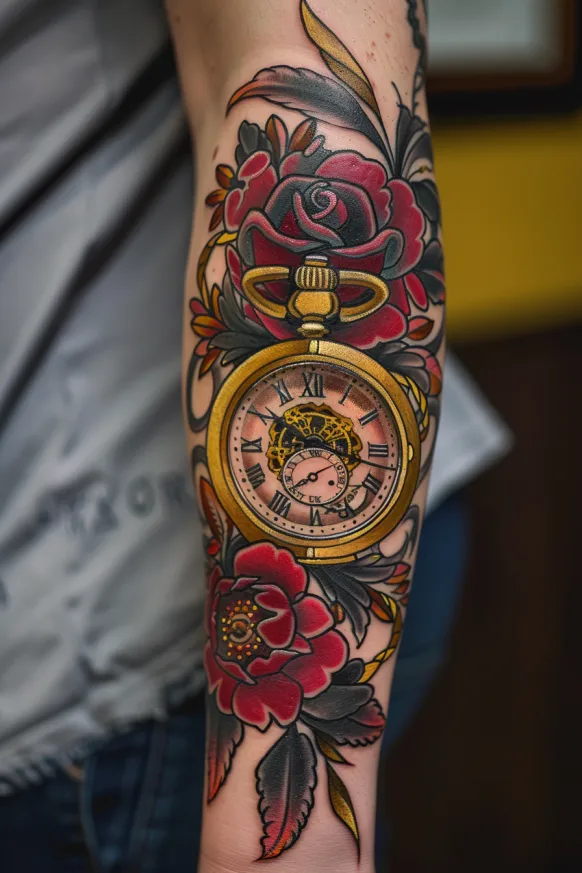 Victorian Pocket Watch and Rose Forearm Tattoo