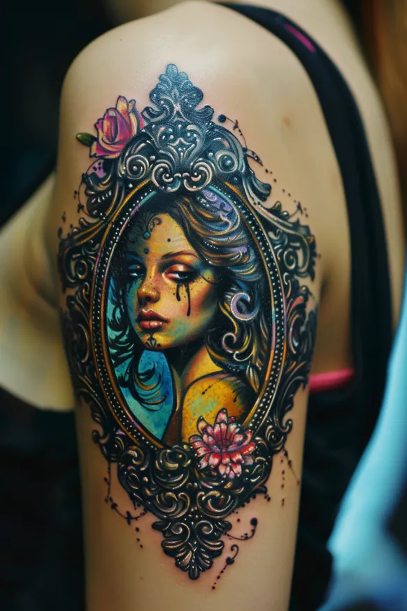 A beautifully ornate Victorian frame encases the face of a mysterious woman, creating a design that feels straight out of a Gothic romance novel. The intricate baroque-inspired detailing on the frame is rich with swirling patterns, adding an air of elegance and old-world charm. The woman s piercing gaze, streaked with what looks like smudged makeup or symbolic tears, gives the tattoo a haunting yet captivating quality. Soft florals accent the frame, blending femininity with a dark, romantic aesthetic. Placed on the upper arm, this piece stands out as both bold and delicate, making it an unforgettable work of art.