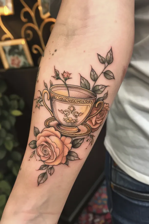 Victorian Tea Cup and Rose Tattoo