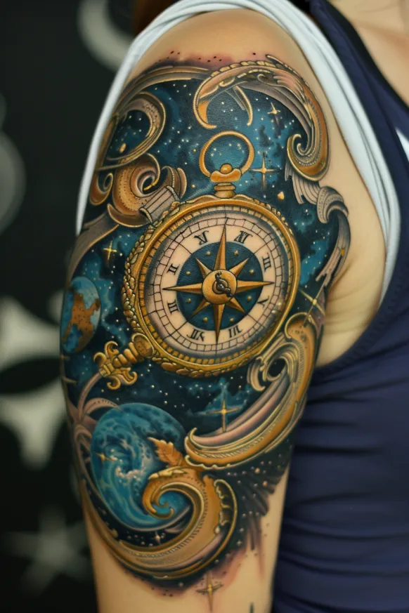 A stunning Victorian pocket watch floats among the stars in this mesmerizing half-sleeve tattoo. The ornate gold casing frames a beautifully detailed compass-inspired clock face, complete with Roman numerals and a vintage aesthetic. Surrounding the watch, swirls of baroque-style embellishments weave through a deep midnight sky, where glowing stars and planets add a touch of cosmic wonder. The balance between antique elegance and celestial mystery makes this design feel both timeless and otherworldly.