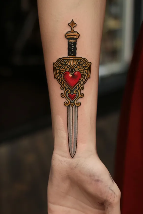 A beautifully ornate dagger pierces through this design, blending elegance and strength in a way that feels timeless. The golden hilt is adorned with intricate Victorian-style filigree, framing a deep red heart-shaped gem at its center. Smaller decorative details extend downward, leading to a sleek, polished silver blade that adds a striking contrast. Placed perfectly on the forearm, this tattoo has a bold yet refined look that feels like something out of a Victorian romance novel with a touch of mystery.