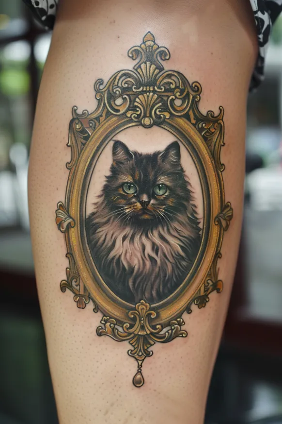 An exquisitely detailed cat portrait sits inside a luxurious Victorian-style gold frame, creating a design that feels like a miniature work of art. The realistic fur texture and piercing green eyes give the cat an almost lifelike presence, while the baroque-style embellishments on the frame add a regal, antique charm. The symmetrical flourishes and intricate gold detailing make this tattoo look like a cherished family heirloom. Placed on the thigh, this piece has an elegant and stately feel, perfect for anyone who wants to honor a beloved feline companion in a truly timeless way.