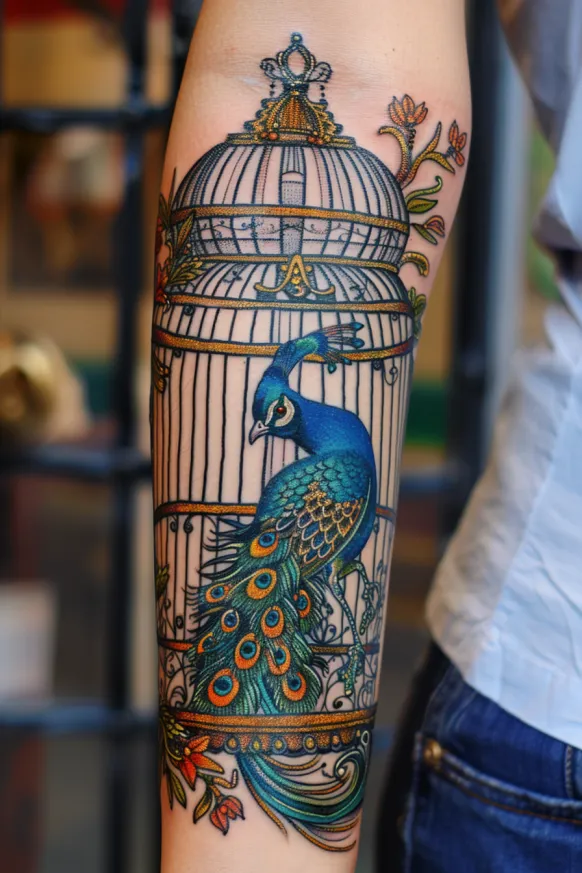 A breathtaking Victorian-inspired birdcage houses a majestic peacock, its feathers cascading in a mesmerizing display of deep blues, greens, and shimmering gold. The cage itself is adorned with intricate gold detailing and delicate floral accents, giving it an air of old-world luxury. The peacock, with its elegant posture and piercing gaze, symbolizes beauty, confidence, and freedom, making this tattoo both visually striking and deeply meaningful. The forearm placement allows the design to stretch gracefully, creating an effect that feels both regal and refined.