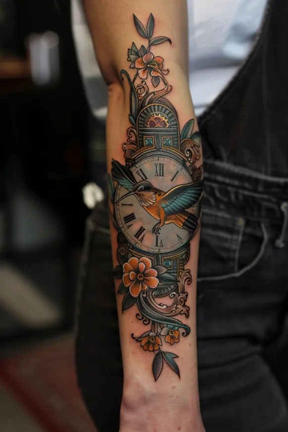 A beautifully detailed Victorian clock sits at the heart of this forearm tattoo, surrounded by ornate golden filigree and delicate floral accents. The clock s Roman numerals and antique design give it a timeless, vintage feel, while a stunning hummingbird in mid-flight adds a sense of movement and freedom. Soft shades of blue, orange, and gold create a harmonious color palette, making the design feel both warm and elegant. Flowing ornamental details complete the piece, giving it an air of graceful sophistication.