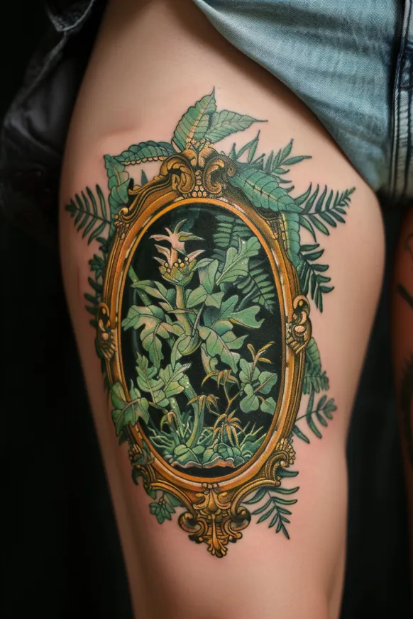 This breathtaking tattoo features an ornate golden frame wrapped in lush green foliage, giving the illusion of a living portrait of nature. Inside the frame, intricate leaves, ferns, and delicate mushrooms create a miniature enchanted forest, as if peering through a secret window into a hidden world. The shading and detail in the leaves add texture, while the frame s baroque elegance balances the wildness of the greenery.