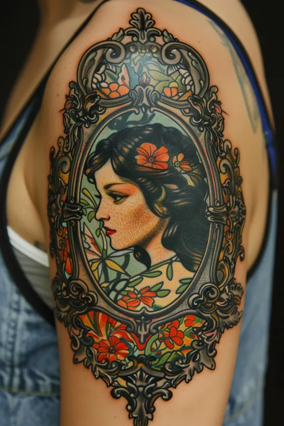 There s something so romantic and nostalgic about this tattoo. The fine detail in the frame, the vintage-inspired floral elements, and the elegant expression all make it feel like a cherished heirloom turned into ink. I love how it captures classic beauty with an artistic twist, making it perfect for someone who appreciates history, femininity, and intricate designs. If you re a fan of Victorian elegance with a touch of mystery, this tattoo is absolutely breathtaking!