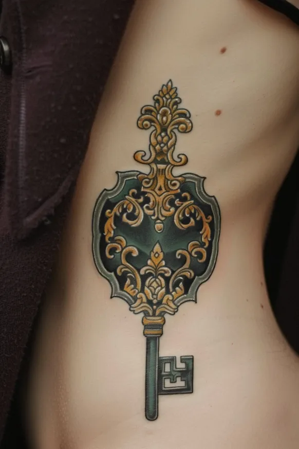 An elegant Victorian skeleton key takes center stage in this beautifully detailed tattoo. The intricate gold filigree and baroque-inspired flourishes give it an air of mystery and sophistication. Deep emerald green accents enhance the antique aesthetic, making it look like a priceless relic from a grand estate. The key s ornamental bow is decorated with delicate symmetrical patterns, while the bit at the bottom has a distinctively regal, vintage design. Placed along the ribcage, this tattoo has a sleek, elongated shape that follows the body s natural contours, adding to its graceful and refined appeal.