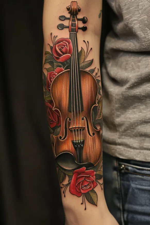 A beautifully detailed Victorian-style violin takes center stage in this forearm tattoo, surrounded by lush red roses and delicate leaves. The warm wood grain of the violin is shaded to perfection, giving it a rich, realistic texture that makes it look almost tangible. Deep red roses wrap around the instrument, adding a touch of passion and elegance, while subtle shading and highlights bring depth and dimension. The flowing composition gives the tattoo a graceful, harmonious feel, making it a perfect tribute to music, art, and timeless beauty.