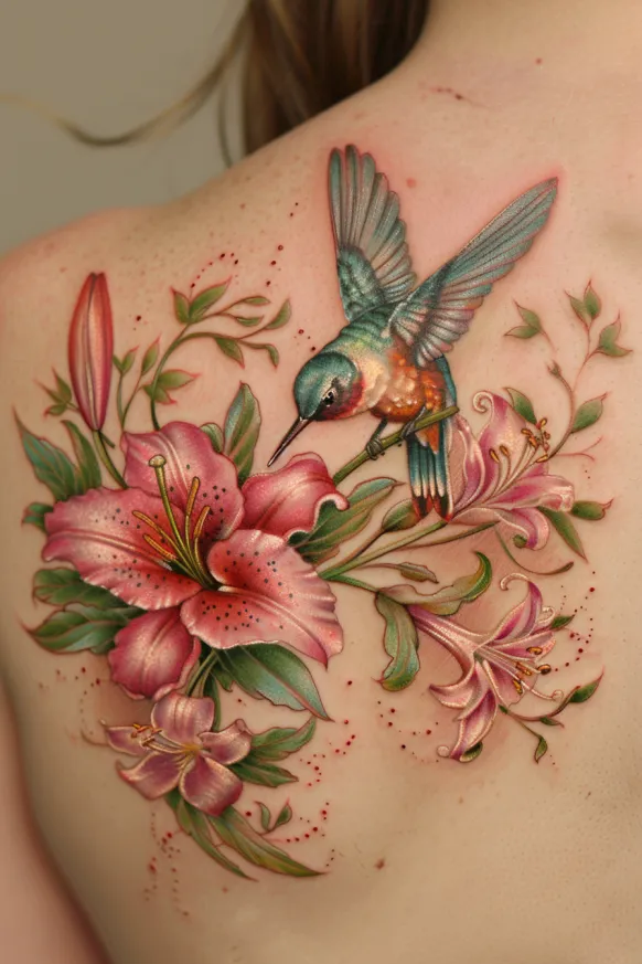 This stunning back tattoo captures a delicate hummingbird in mid-flight, hovering near lush pink lilies in full bloom. The feathery detail on the bird shimmers with hues of turquoise, emerald, and copper, making it look almost iridescent. Surrounding the flowers are lush green leaves, all enhanced with subtle Victorian-style flourishes that give the piece a refined, antique-inspired charm.