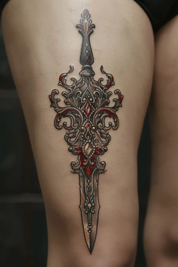 This piece has such an air of power and elegance, and I love how it balances delicacy with strength. The baroque-style decorations make it feel feminine yet fierce, and that deep crimson adds a touch of drama and passion. There s something undeniably regal and mysterious about a dagger tattoo, and this one looks like it carries a story of its own.