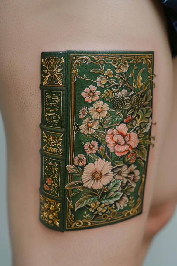 An exquisitely detailed Victorian book cover comes to life in this breathtaking tattoo. The deep green leather-bound design is decorated with golden filigree and intricate floral embellishments, making it look like a cherished antique novel straight from a grand library. The delicate hand-painted flowers bloom across the cover, softening the structure with a romantic, feminine touch. Ornate lettering on the spine adds to the old-world charm, making this tattoo feel like a work of literary art on the skin.