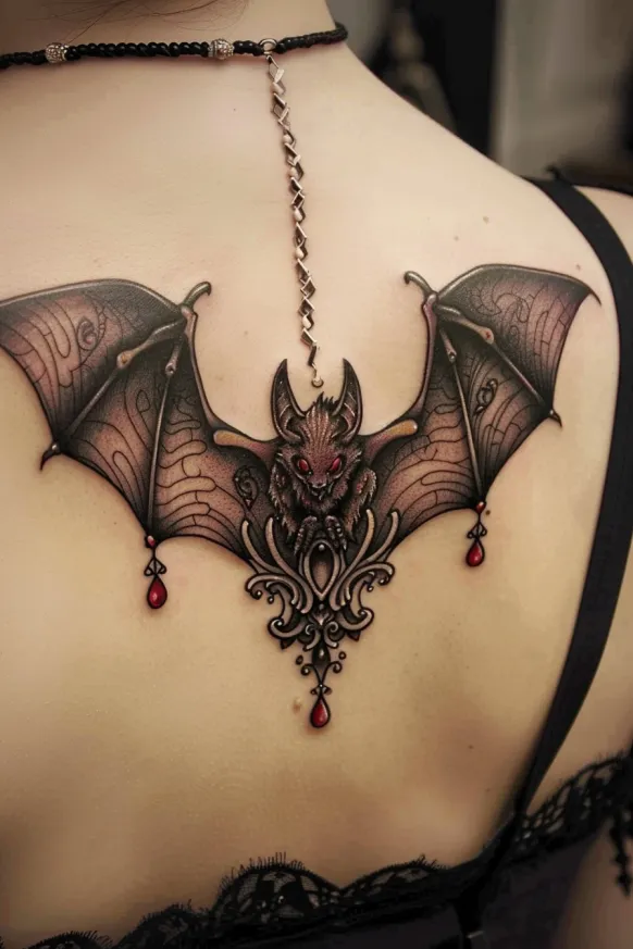 An elegantly ornate bat tattoo spreads its wings across the upper back, blending dark Victorian aesthetics with gothic charm. The intricate filigree details on the wings resemble antique lace, while the bat s piercing red eyes and delicate dangling red gemstones add a touch of luxurious drama. Soft shading gives the wings a delicate, almost sheer appearance, making the bat look like a Victorian lace choker transformed into ink. Positioned perfectly between the shoulder blades, this design feels like wearable gothic jewelry.
