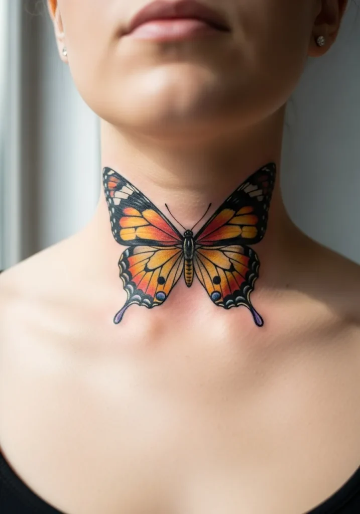 This vibrant butterfly tattoo sits perfectly in the center of the neck, its wings spread wide across the collarbone area. The colors blend shades of orange, yellow, and black in a lifelike gradient that looks straight out of nature. Every line and dot feels intentional, giving it that soft yet mesmerizing realism.
