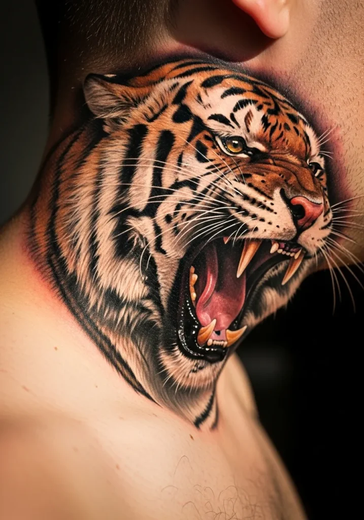 This incredibly lifelike tiger tattoo stretches across the side of the neck, showcasing sharp teeth, glistening eyes, and detailed fur patterns in shades of orange, black, and white. The artist captured the depth and shine of every whisker, creating a sense of motion and power. The placement makes it impossible to miss, giving it an undeniably bold presence.