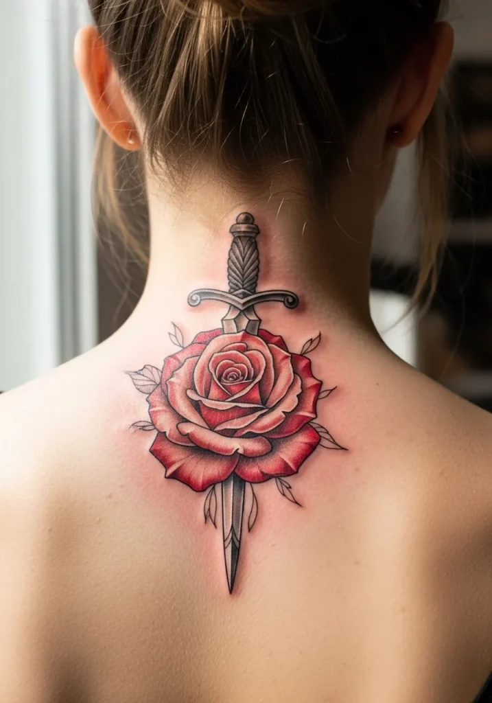 This elegant tattoo on the back of the neck features a detailed red rose pierced by a silver dagger. The petals look soft and layered, while the dagger s handle shows intricate line work and shading. The balance of red and metallic tones gives it a stunning contrast that stands out beautifully on the skin.