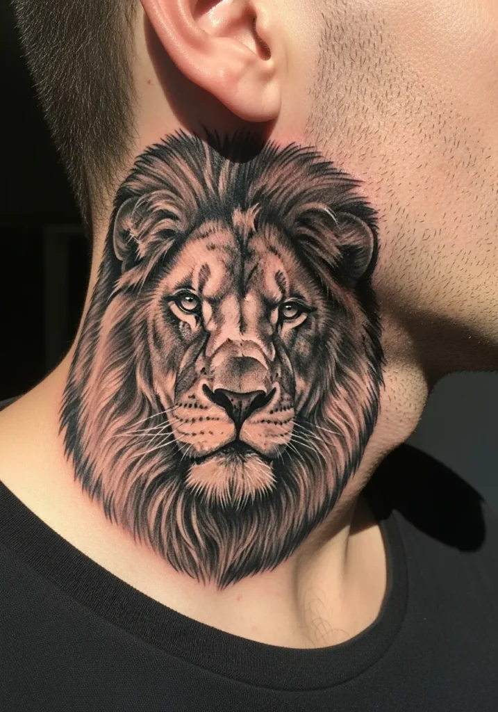 This fierce realism tattoo captures the face of a lion on the side of the neck with incredible detail. Every strand of the mane is shaded to perfection, while the eyes gleam with strength and confidence. The soft gradient shading gives it a regal, lifelike presence.