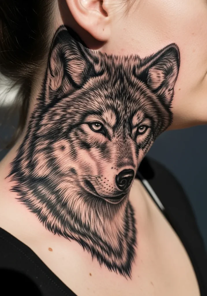 This gorgeous black and grey wolf tattoo covers the side of the neck with impeccable shading and lifelike fur texture. The piercing eyes draw you in, while the soft gradient around the edges gives it a smooth, natural finish. The placement perfectly follows the jawline, adding to its strong aesthetic.