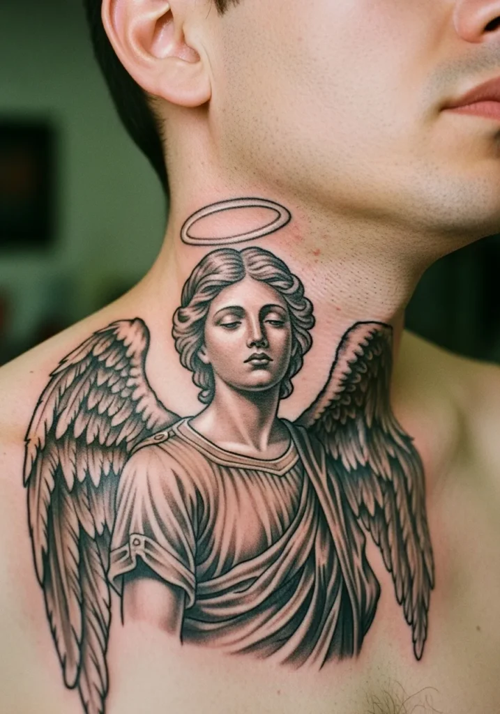 This stunning black and grey realism tattoo shows a serene angel figure with detailed wings and a soft halo above the head. The shading and texture of the feathers bring it to life, while the angel s calm expression gives a sense of peace and protection. The design flows beautifully from the chest onto the neck, creating a seamless transition.