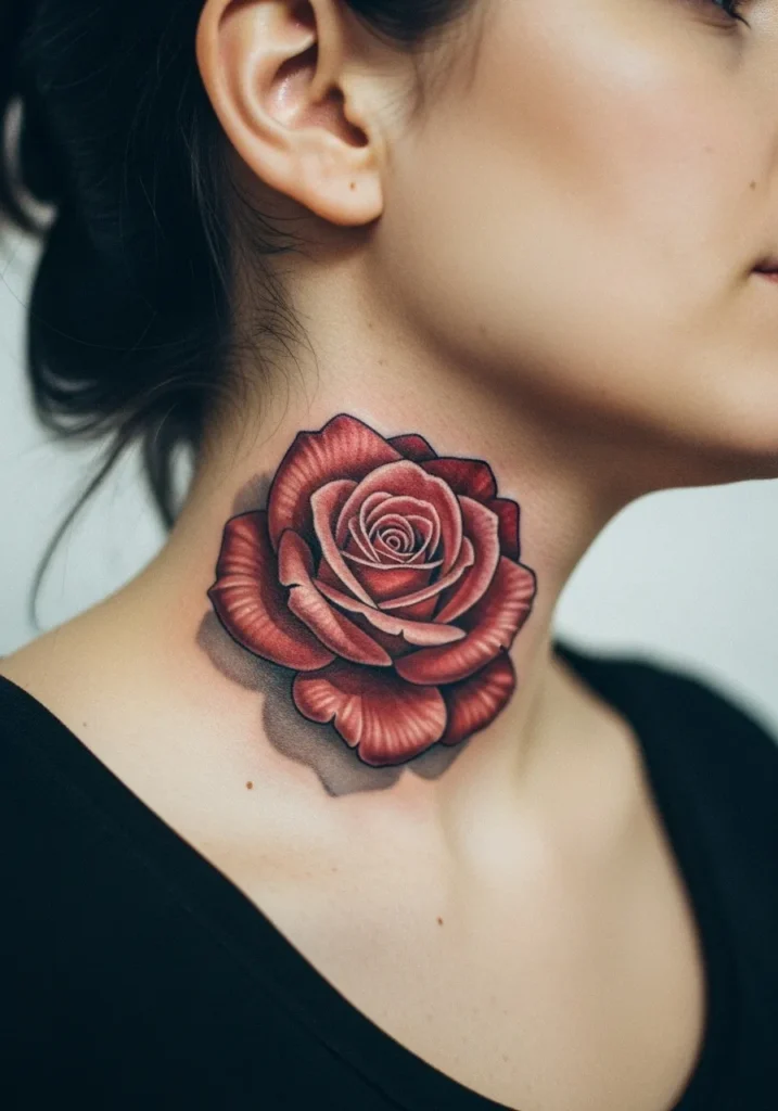 This stunning realism tattoo features a full-bloom red rose centered on the side of the neck. The petals show detailed shading and a velvety texture that almost looks touchable. The deep reds fade into soft pink tones, with a shadow beneath adding dimension and making the flower appear raised from the skin. It s a medium-sized piece that perfectly complements the curve of the neck, making it both feminine and fierce.