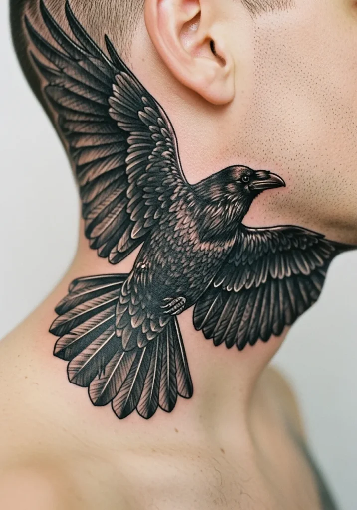 This captivating realism tattoo features a black raven spreading its wings across the side of the neck. Each feather is shaded with incredible precision, giving it a textured, almost three-dimensional effect. The dark tones contrast sharply with the skin, making the bird appear ready to take flight.