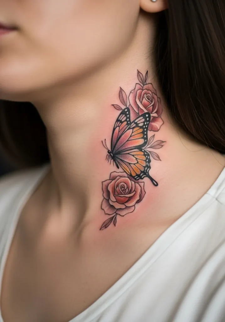 This delicate tattoo features a realistic butterfly resting among two softly shaded roses on the side of the neck. The butterfly s wings glow in shades of orange, pink, and black, while the roses are inked in muted tones for balance. The soft blush background ties everything together beautifully.