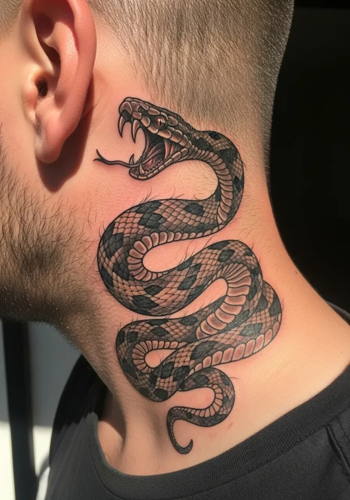 This realistic black and grey snake tattoo wraps elegantly around the neck, starting near the jawline and coiling downward. The detailing on the scales gives it lifelike texture, and the open mouth showing sharp fangs adds a fierce, striking energy. The shading captures the light beautifully, creating the illusion of movement on the skin.